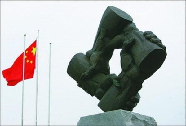 ⑩都江堰市七一聚源中学的聚源雕塑,四只紧握的大手象征着凝聚八方之力的含义。