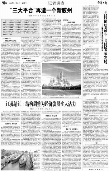 胶州有三个新兴的产业平台,其中,胶州湾产业新区是一个以LED半导体为主体产业的先进制造业基地,仅这个新区达产后,其经济总量就会大大超过目前胶州市的经济总量;胶州湾国际物流中心是一个以新兴的铁路集装箱运输集散地为基础的物流枢纽,它将给胶州带来人流、物流、资金流的繁荣,其产业深度和广度在未来是不可限量的;少海新城则是胶州市围绕着一个比西湖还大的淡水湖面,打造的一个集居住、休闲、度假旅游、商业文化等于一体的新城区,它本质上是一个第三产业的新聚集区。所以,称“三大平台”再造一个新胶州,也显现出了未来胶州的产业特色。