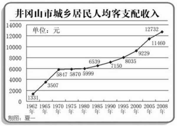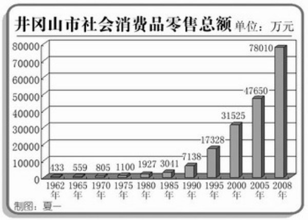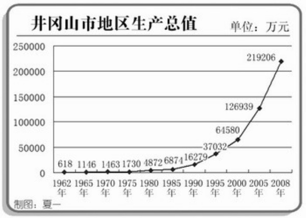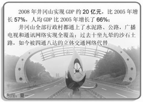 采访中,记者获得这样一组数据:2008年井冈山实现GDP约20亿元,比2005年增长57%,人均GDP比2005年增长了66%;而井冈山全部行政村都通上了水泥路、公路,广播电视和通讯网络实现全覆盖;过去十坐九晕的沙石土路,如今被四通八达的立体交通网络代替,拉近了井冈山与世界各地的距离……