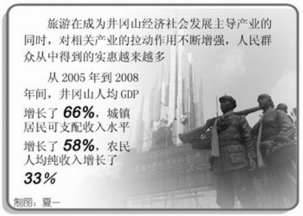 旅游在成为井冈山经济社会发展主导产业的同时,对相关产业的拉动作用不断增强,人民群众从中得到的实惠越来越多。据悉,从2005年到2008年间,井冈山人均GDP增长了66%,城镇居民可支配收入水平增长了58%,农民人均纯收入增长了33%。
