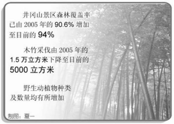 与此同时,井冈山景区森林覆盖率已由2005年的90.6%增加至目前的94%,木竹采伐由2005年的1.5万立方米下降至目前的5000立方米,野生动植物种类及数量均有所增加。