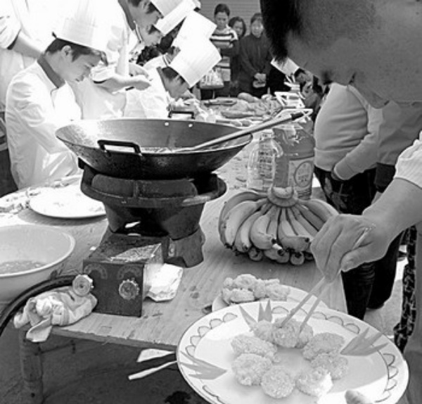 11月25日,参赛选手以香蕉为原料制作菜肴。当日,一场“香蕉宴”擂台赛在广西南宁市一家香蕉批发市场举行,吸引大批市民前来一展厨艺。此次比赛旨在让更多市民了解香蕉的益处、多吃香蕉,缓解因寒潮导致的香蕉滞销问题。喻湘泉摄(新华社发)