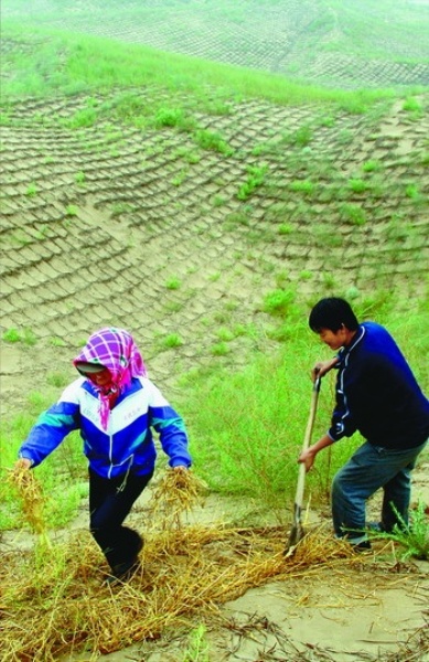 图1:农民张建宁(右)、桂丽芝在自家承包的沙地里扎麦草方格。作为全国防沙治沙示范市,灵武市确定“六个一”的奋斗目标,即一人一年扎一万个草方格,挖一万个树坑,植一万株树,治沙造林一百亩,从治沙造林中实现增收一万元。要做到可持续发展,生态环境的改善与保护是重中之重。