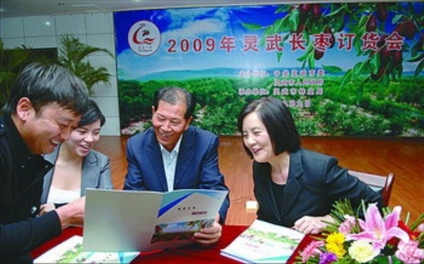 图2:2009年灵武长枣订货会上,400余万公斤长枣被客商抢购一空。西部经济欠发达地区的发展战略中,特色产品的规模生产、规模经营、规模销售是成功经验,灵武市在这方面紧盯市场,在市场化运作中让自己的品牌立得住、销得开。