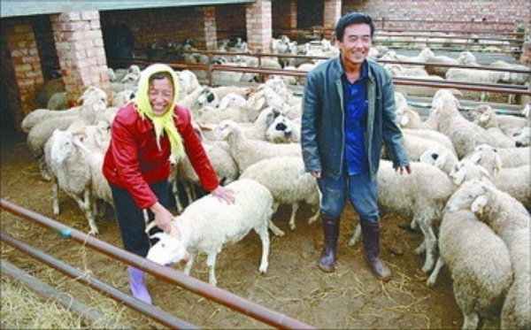 图5:灵武市郝家桥镇新民村农民杨杰(右)夫妇在察看他们饲养的600只羊。灵武市把羊产业确定为农业产业化发展的突破口,2009年将新建万只规模化养殖园区10个,千只规模化养殖场23个。