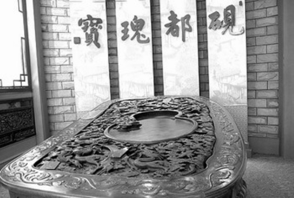 图2:端砚史上最大的一方老坑砚———九龙戏宝砚。长1.93米,宽0.93米,厚0.33米,重600公斤。集石眼、鱼脑冻、蕉叶白、天青等名坑优点于一身。由中国工艺美术大师黎铿设计、监制,作为肇庆市的“市宝”,由博物馆永久珍藏。