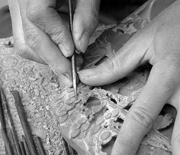 设计好的砚璞,就可以拿给砚工雕刻了。雕刻过程中要运用多种技法表现主题,雕刻讲究刀法,有深雕、浅雕雕刻,还有细刻、线刻和通雕等。优质的砚石则少雕或不雕,称为平板砚。
