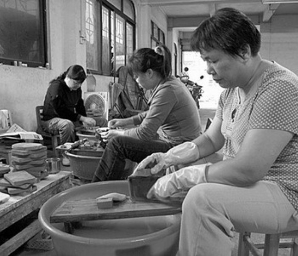 打磨是制砚的最后一道工序,用粗细不等的天然滑石,由粗到细,反复打磨雕刻的凿口、刀路,使砚台的手感平整、光滑、细腻。