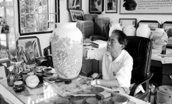 图2:刘超鸿是景德镇陶瓷学院的副教授,也是有名的雕塑大师,他在雕塑瓷厂厂区创办了自己的工作室。图为刘超鸿在为陶瓷样坯上色。