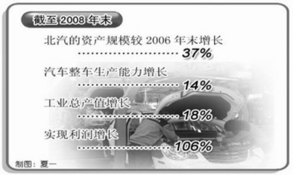 通过两年多来的资源整合工作,北汽设立了海纳川股份公司、北汽鹏龙公司、资产管理公司、研究总院,结合北京现代、北汽福田、北京奔驰、北汽有限四个整车企业,初步形成了整车制造、零部件、服务贸易、自主研发、企业调整退出的汽车产业链格局,集团构架基本形成,功能也不断完善,集团化建设取得了很大成效。截至2008年末,北汽的资产规模较2006年末增长37%,汽车整车生产能力增长14%,工业总产值增长18%,实现利润增长106%。
