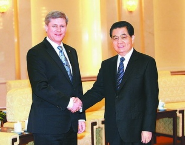 哈珀完全同意胡锦涛对发展中加关系的重要主张,表示加中两国有着非常友好的关系,建交近40年来,两国各领域合作取得重大进展和成就。加方奉行一个中国政策,尊重中国领土完整,愿从长远角度看待和发展两国合作关系,对中国在国际事务中发挥更大作用感到高兴。加中两国互补性很强,进一步发展经贸关系潜力巨大,在能源、环境等领域合作大有可为。加方愿同中方一道,反对贸易保护主义,努力促进世界经济增长。进一步加强多边领域合作和人文交流,加强两国人民友好的纽带。