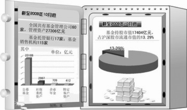 □ 截至2009年10月,60家基金管理公司管理资产27306亿元,基金持股市值占沪深股市流通市值的13.29%。
