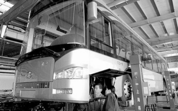 | 右图:一汽加快混合动力汽车产业化进程。这是一汽客车有限公司为长春市生产的天然气电力混合动力客车在进行最后的装配。
