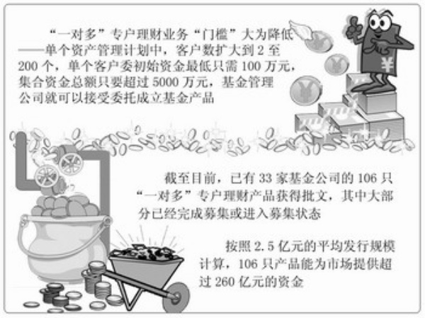 今年5月,证监会公布《关于基金管理公司开展特定多个客户资产管理业务有关问题的规定》,基金管理公司的“一对多”专户理财业务“开闸”。此前,基金公司专户理财业务只有“门槛”较高的“一对一”专户理财———基金公司为单个客户管理5000万元以上的初始资金;“一对多”专户理财业务“开闸”后,理财“门槛”大为降低———单个资产管理计划中,客户数扩大到2至200个,单个客户委初始资金最低只需100万元,集合资金总额只要超过5000万元,基金管理公司就可以接受委托成立基金产品。