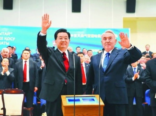 12月12日,国家主席胡锦涛在阿斯塔纳与哈萨克斯坦总统纳扎尔巴耶夫共同出席中哈天然气管道竣工仪式。这是两国元首通过视频向中哈天然气管道工程建设者招手致意。 新华社记者 饶爱民摄
