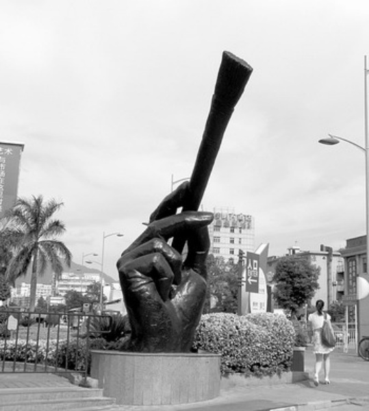 图1 村口的雕塑生动地体现了大芬村的产业特点。