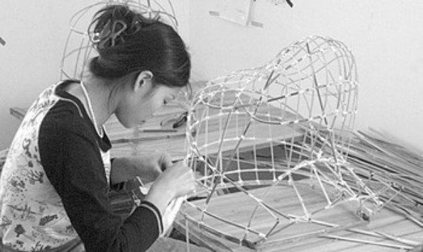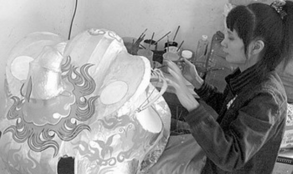 走进李荣仔家楼房的一楼堂屋,几个女工正在专心致志地扎制醒狮头,她们有的在用竹条编狮头造型,有的则在编好的造型上糊贴纱布,有的正在给狮头描彩上色。