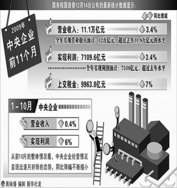 目前,中央企业前11月实现利润已超过去年全年。去年,受金融危机和政策性调控等诸多因素的影响,中央企业实现利润6961.8亿元,比2007年下降了30.8%。