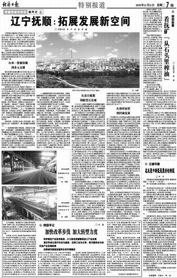 在抚矿集团页岩炼油厂的车间里,记者参观了被称作“从石头里榨油”的一系列工艺:破碎后的页岩从纵贯厂区的传送带上投入炉中,经过干馏、油气蒸发等,最后从银色的沉降分离罐里,产出了被称作“人造石油”的页岩原油。“页岩原油可以作为柴油的便宜替代品,直接用作燃料油外售。”抚矿集团计划处处长李旭告诉记者,抚顺地区的油母页岩含油率较高,每100千克的页岩可炼制8至10千克的石油。在大庆油田的开发成功之前,抚顺生产了数百万吨页岩原油,为新中国的经济建设提供了能源。近年来抚顺矿井陆续关闭,以煤矿开采为主业的抚顺矿业集团逐渐把利用页岩炼油作为其突破发展的出路之一。