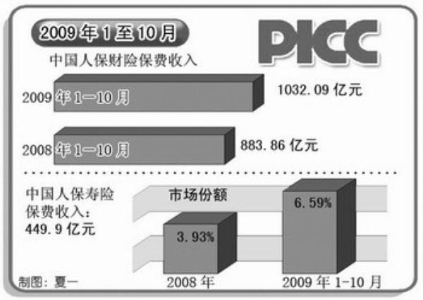 保监会公布的财险与寿险公司原保险保费收入数据显示,今年前10月中国人保财险居财险业公司排名首位,为1032.09亿元,较其去年同期的883.86亿元增加16.77%;人保寿险保费为449.9亿元,其市场份额由去年3.93%增长至目前的6.59%,几乎增长一倍。