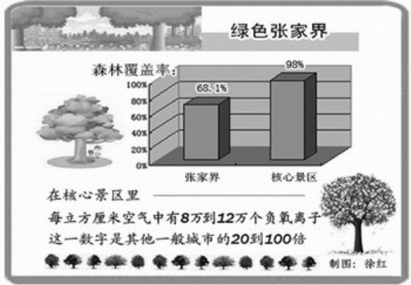 张家界的空气是“绝无仅有”的。该市林业局总工程师王远刚给了记者一组数字:张家界的森林覆盖率达到68.1%,核心景区的森林覆盖率高达98%!张家界的核心景区里,每立方厘米空气中有8万到12万个负氧离子,是一般城市的20到100倍!