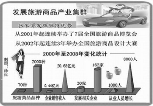 发展旅游商品产业集群,张家界有独特优势。从2001年起,张家界连续举办了7届全国旅游商品博览会,2002年起,连续3年举办全国旅游商品设计大赛。
