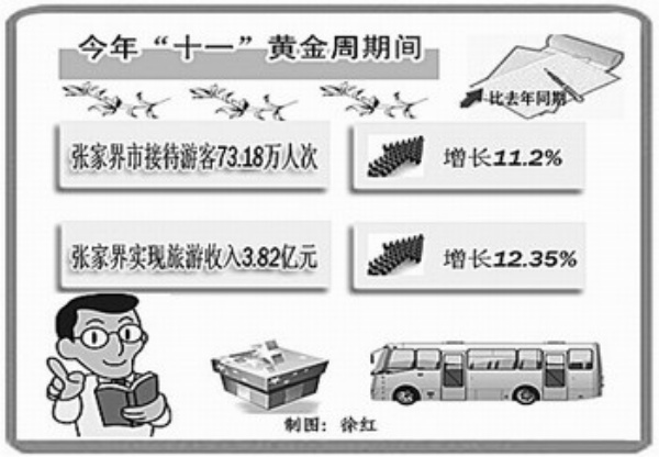 在国际金融危机的影响下,张家界创新旅游营销,今年“十一”黄金周,张家界市接待游客73.18万人次,比去年同期增长11.2%;实现旅游收入3.82亿元,比去年同期增长12.35%。