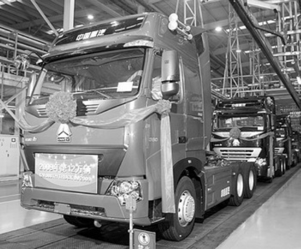 左图 12月11日,中国重汽集团今年生产的第12万辆车在济南卡车股份有限公司隆重下线。至此,重汽今年产销同比增长11.2%,进入全球重卡产销前三位。今年1月—11月,中国重汽累计产销重型汽车114749辆,销售收入超过500亿元,实现工业增加值54亿元。 茅岙海摄