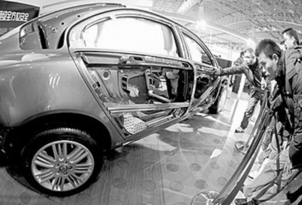 左图 在第五届中国(长沙)国际汽车博览会上,许多参展企业设立了汽车安全性能展示区,宣传汽车的安全性。 新华社记者 李 尕摄