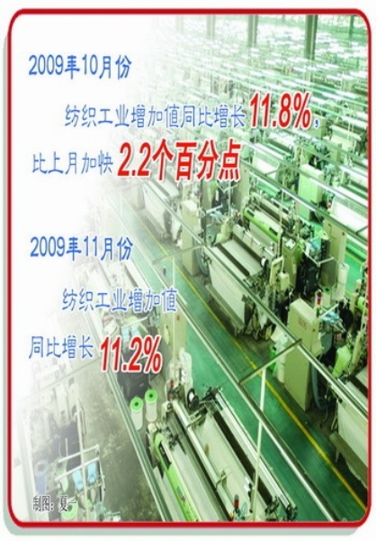 去年下半年以来,受国际金融危机的冲击,我国纺织工业遭遇了前所未有的困难。对此,我国连续4次提高了纺织品服装的出口退税率,从11%提高到16%;今年4月,国务院又公布了《纺织工业调整和振兴规划》,以自主创新、技术改造、优化布局为重点,推动纺织工业结构的调整和产业升级,提高国内外市场的开拓能力,取得了明显效果,生产增速、固定资产投资、行业效益等主要经济指标稳步回升。10月份,纺织工业增加值同比增长11.8%,比上月加快2.2个百分点,出口交货值同比增长0.1%,自去年底11个月以来首次实现正增长。11月份,纺织工业增加值同比增长11.2%。