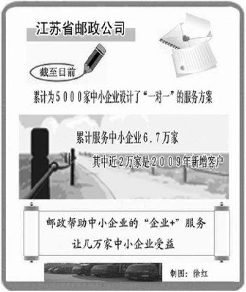 江苏省邮政公司认真贯彻省委、省政府的决策部署,充分发挥邮政网络资源优势,创新思路,改进服务,积极主动地服务中小企业。一是加强品牌建设。江苏省邮政公司推出了专为中小企业设计的“企业+”服务品牌,在全省各市、县邮政局举办了形式多样的服务中小企业推介会,利用信息流、实物流和资金流等综合优势,为中小企业成长不断添加新的动力。二是提升服务水平。通过广泛深入的走访,加强与中小企业的沟通,了解实际需求。自2007年10月在全省开展邮政服务中小企业走访活动以来,全省邮政累计走访中小企业27万家。在此基础上,为5000家中小企业设计了“一对一”的个性化服务方案。三是提供金融服务。对年销售额在1000万元以下的小企业推出了小企业贷款业务,已累计向12.5万户客户发放各类贷款100亿元。邮政还为中小企业提供代发工资、商务汇款、资金结算、小额信贷等相对完备的金融服务项目,切实改善了中小企业的服务环境。四是开展数据库营销。江苏邮政积极开展数据库营销,帮助中小企业拓宽营销渠道,实现精准营销。2007年—2008年,全省邮政累计为近1.4万个中小企业制作、寄递贺卡8400多万枚;今年以来累计为1.3万户中小企业提供了近3600万条名址开展数据库商函营销。