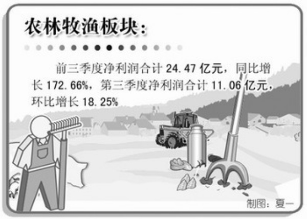 统计显示,农林牧渔板块前三季度净利润合计24.47亿元,同比增长172.66%,第三季度净利润合计11.06亿元,环比增长18.25%。分析人士预计,随着经济的回暖,农产品的需求还将上升,未来收入和利润回升的趋势将继续延续。