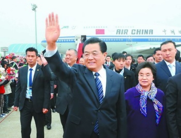 中共中央政治局委员、国务委员刘延东,中央书记处书记、中央办公厅主任令计划,中央书记处书记、中央政策研究室主任王沪宁,全国人大常委会副委员长兼秘书长李建国,全国政协副主席、国务院港澳事务办公室主任廖晖,中央军委委员、总参谋长陈炳德,胡锦涛主席办公室主任陈世炬等陪同人员同机抵达。