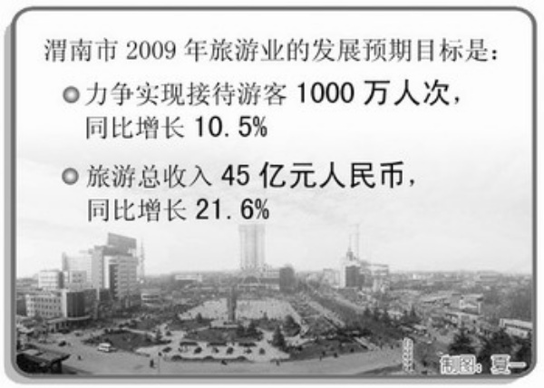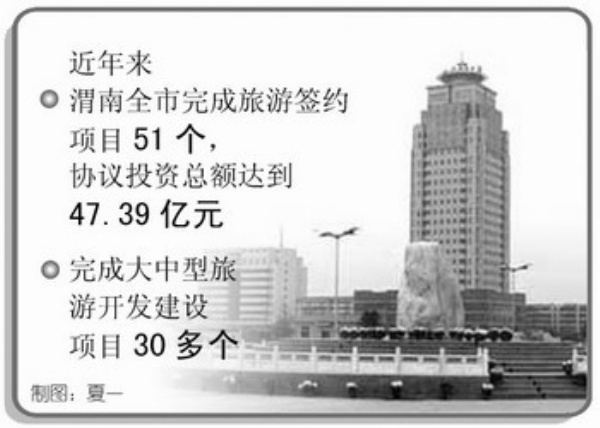 近年来,渭南全市完成旅游签约项目51个,协议投资总额达到47.39亿元。目前,渭南的旅游资源开发已初具规模,完成大中型旅游开发建设项目30多个,建成新的旅游景区4个,旅游景点120余处,全市基本形成了山水观光旅游、湿地休闲度假、东府民居民俗、文化旅游等多元化的旅游产品结构体系。渭南市2009年旅游业的发展预期目标是:力争实现接待游客1000万人次,同比增长10.5%;旅游总收入45亿元人民币,同比增长21.6%。