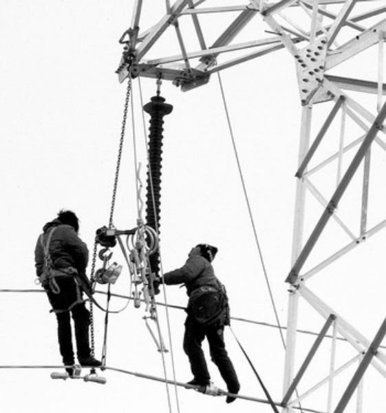 工人们在塔克拉玛干沙漠腹地的高压线路铁塔上作业(12月9日摄)。