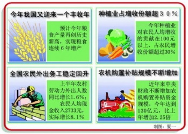 “今年种植业生产形势好,既表现在粮食等主要农产品有效供给增加上,还表现在对农民收入增加的贡献上。”农业部有关负责人表示,“初步测算今年种植业对农民人均增收贡献在100元以上,占农民增收份额超过30%。”