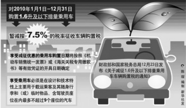 本报北京12月23日讯 记者孙勇报道:财政部和国家税务总局今日对外公布,明确对2010年1月1日至12月31日购置1.6升及以下排量乘用车,暂减按7.5%的税率征收车辆购置税。