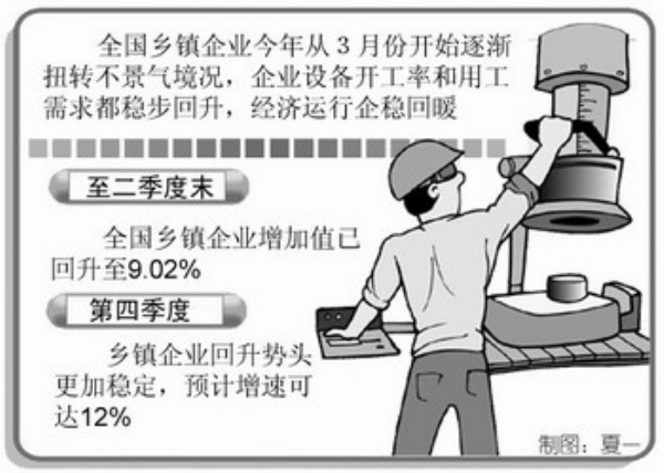 目前乡镇企业的发展形势,处在加快恢复增长阶段,乡镇企业对我国经济企稳回升作用值得期待。据统计,全国乡镇企业从3月份开始逐渐扭转不景气境况,企业设备开工率和用工需求都稳步回升,经济运行企稳回暖,至二季度末,全国乡镇企业增加值增速已回升至9.02%;第三季度,乡镇企业继续保持了回暖趋势,外向型企业订单数量也有一定回升;第四季度乡镇企业回升势头更加稳定,预计增速可达到12%。