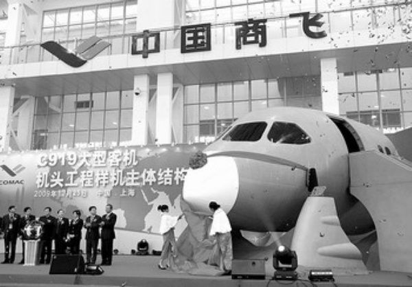 C919大型客机机头工程样机研制由中国商用飞机有限责任公司所属的上海飞机设计研究院、上海飞机制造有限公司和中国航空工业集团公司所属成都飞机工业有限责任公司联合研制。今年9月1日在成都开工,12月10日主体结构在成都飞机工业公司下线验收。计划于2010年转入系统安装调试。