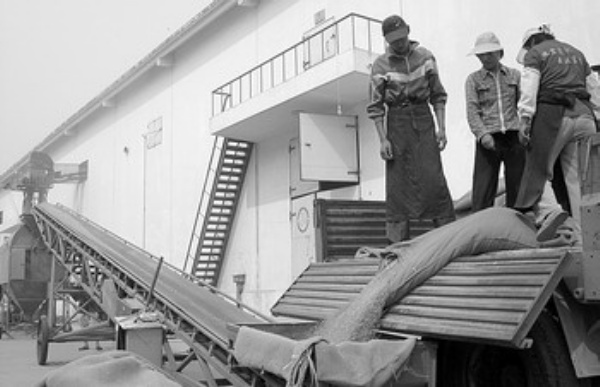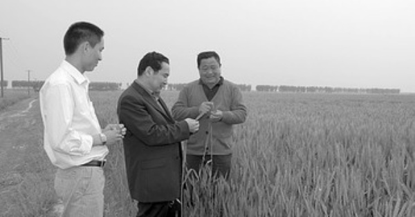 上图:在全国粮食生产标兵县霍邱县,粮食专家和种粮大户查看粮食生产情况。