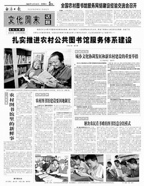 公共文化建设一直是话题版关注的焦点之一。一年来,围绕全国文化共享工程建设、农村公共图书服务体系建设、农家书屋等展开的一系列报道,都生动展示了我国在公共文化建设、尤其是在新农村文化建设上取得的可喜成就。
