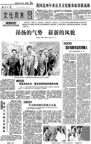 今年是新中国成立六十周年。全国各地举办了一系列献礼演出和献礼片展映活动。话题版以五个整版的篇幅,对这些献礼演出和献礼展映活动给予了热情关注。