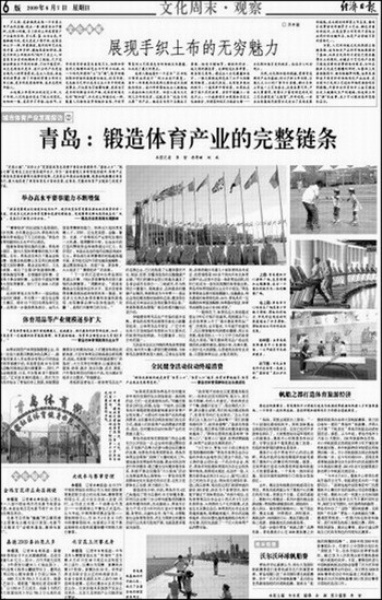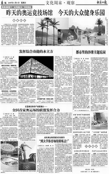 面对这些变化,这一年《观察》先后推出了“城市体育产业发展”系列报道,以及全民健身和十一届全运会的专版。从现象到数据,从个体到群体,在《观察》版的文字中都可以找到。全民健身和体育产业是观察的重点———从5月31日起,从北京到青岛、成都、晋江、深圳、济南、广州,记者李丹、李哲、佘颖、乔申颖、王信川、姜天骄、亢舒深入到这些城市的体育场馆、健身路径……为读者带来有关这些城市体育产业发展的详尽报道;8月9日,《观察》的视角对准了今年首次启动的全民健身日活动;10月11日,第十一届全运会召开在即,《观察》的目光则投向了全运会。在这一系列报道中,全民健身和体育产业始终是《观察》视野中最重要的目标。