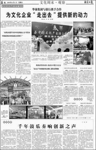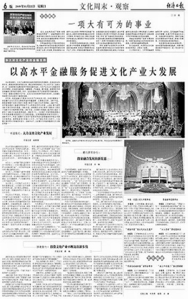 10月25日的《观察》打开了一个新的系列:“加大对文化产业的金融支持”。当期的“编者按”中提到,《文化产业振兴规划》提出,鼓励银行业金融机构加大对文化企业的金融支持力度;积极倡导鼓励担保和再担保机构大力开发支持文化产业发展、文化企业“走出去”的贷款担保业务品种;支持有条件的文化企业进入主板、创业板上市融资,鼓励已上市文化企业通过公开增发、定向增发等再融资方式进行并购和重组,迅速做大做强;支持符合条件的文化企业发行企业债券。推出这组报道的目的,在于从不同角度反映近年来金融机构和文化企业积极破解制约文化产业发展的金融问题所作出的探索,以期推动有关各方不断创新金融服务,为文化产业的快速发展建立更加良好的金融环境。比起以前的电影、动漫、体育等关键词,这次的解读略过严谨,却同样反映了文化产业发展进程中的一个重要现象。