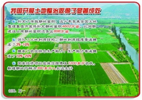 袁山村仅是我国实行大规模土地整治的一个缩影。国土资源部有关负责人表示,我国开展土地整治取得了显著成效:一是补充了有效耕地面积,近十年多来全国土地整理复垦开发共补充耕地面积4602万亩,比同期建设占用耕地面积还多出898万亩;二是优化了土地利用结构,耕地利用程度普遍提高了3%—10%;三是提高了农业综合生产能力,生产能力普遍提高了10%—20%;四是国家投资项目实施范围惠及1200多万农民,新增耕地可解决390多万人的长远生计,项目建设直接增加了当地农民的收入;五是促进了农田生态保护和建设,有力地支持了西部和灾毁地区生态恢复和治理。
