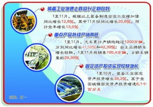 在应对国际金融危机的过程中,我国装备制造工业增速止跌回升企稳向好。1至11月,规模以上装备制造企业工业增加值同比增长12.8%,其中11月份同比增长20.8%,预计全年增长13.5%。