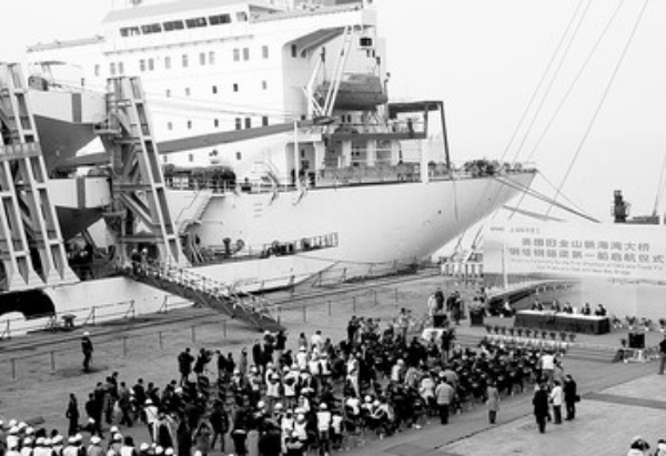 十二月二十九日,由上海振华重工(集团)股份有限公司建造的奥克兰新海湾大桥首批钢箱梁,从上海长兴岛随船起航驶往美国加州海湾地区。 新华社记者 陈 飞摄