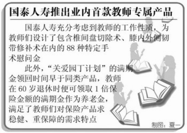 | 本报讯 日前,国泰人寿针对教师群体,推出业内首款教师专属产品———“国泰关爱园丁保险计划”。该计划保障项目包括特定手术、住院日额、身故、意外身故或残疾、养老金等。另外,国泰“关爱园丁计划”在意外附约中加入了寒暑假意外身故或残疾加倍给付的保险内容,若老师们在寒暑假期间意外身故,可获高达30万元的赔偿,这无疑为利用假期出游的教师提供了更多的 |