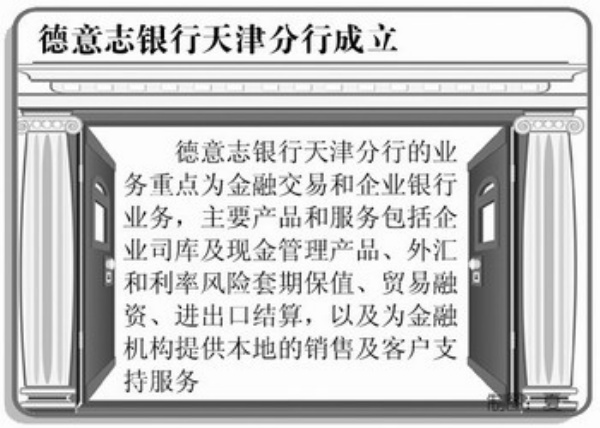 | 本报讯 12月8日,德意志银行(中国)有限公司宣布,位于和平区南京路津汇广场的德银中国天津分行正式成立。在现有北京、上海和广州三地分行的基础上,德意志银行在中国的业务覆盖通过天津分行将进一步扩大。德意志银行于2009年7月获中国银行业监督管理委员会批准筹建天津分行。 (董露茜)
