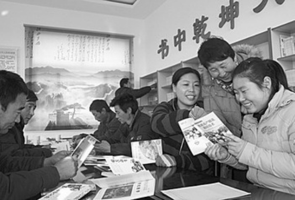 12月25日,山东省无棣县柳堡乡谭家村农民谭桂英(右三)正在社区的“农家书屋”里和村里的姐妹们交流棉花种植经验。近年来,该县不断加强农村和谐社区建设,让社区成为丰富居民文化生活、提高居民素质的重要阵地。 本报记者 单保江 通讯员 蒋惠庆摄影报道